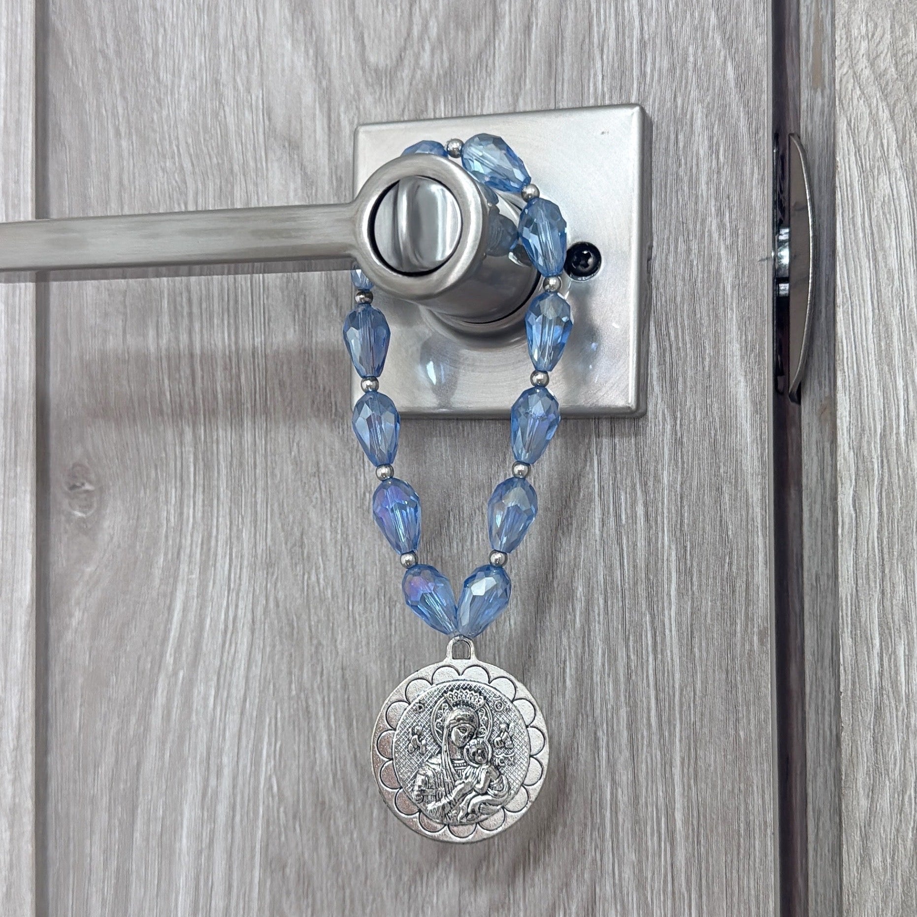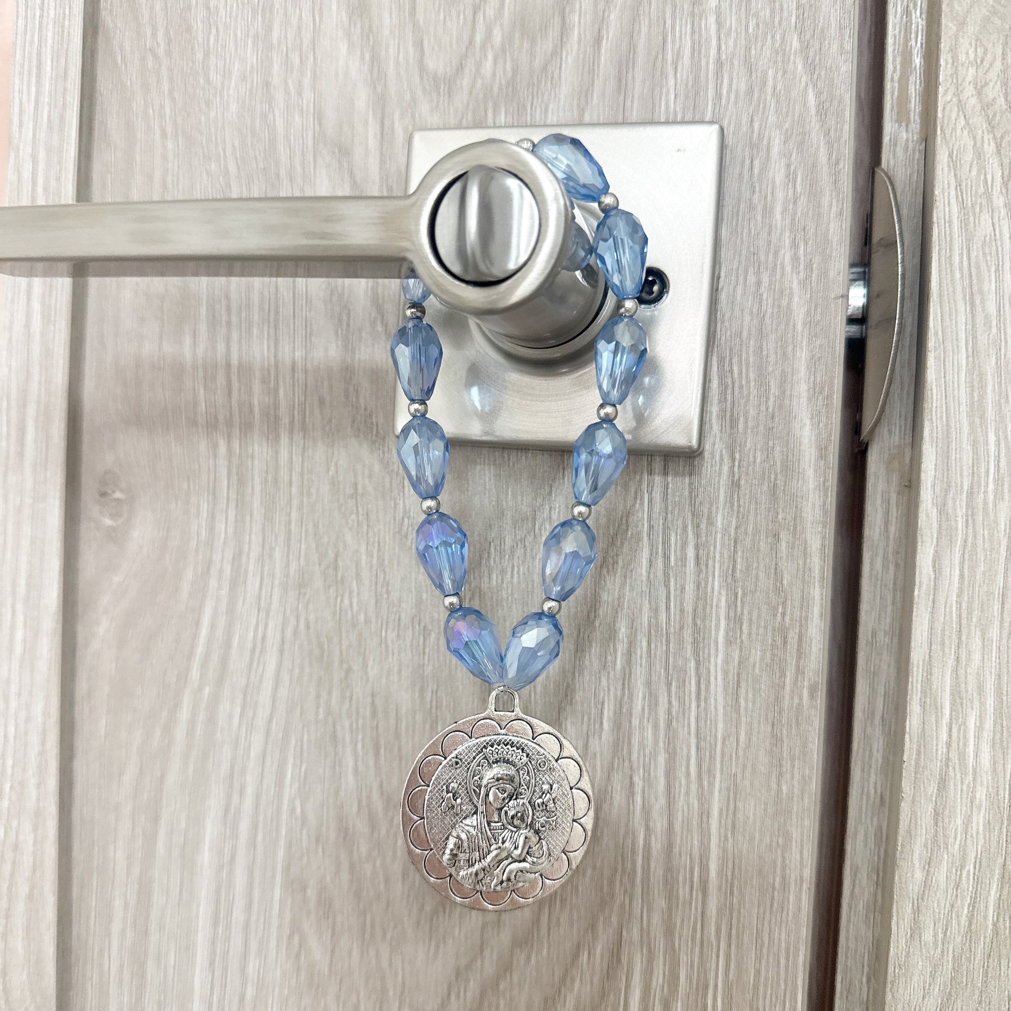 Bendición de hogar (para colgar en la puerta) elaborada en cristales, con balines de acero inoxidable y medalla de Virgen María en baño en rodio.