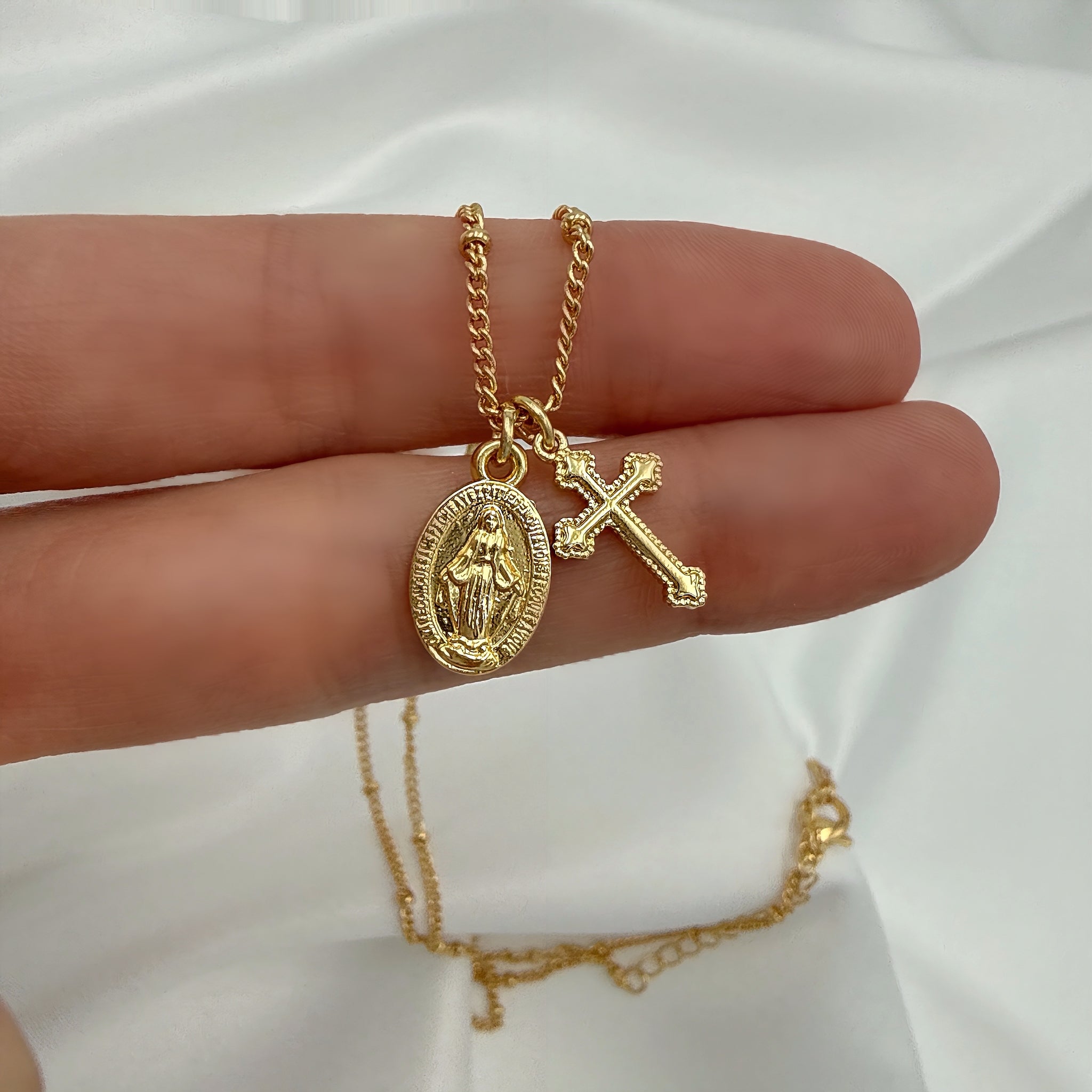 Hermosa cadena italiana chapada en oro 18K, diseñada con delicadeza y devoción. Incluye un elegante dije de la Virgen de la Medalla Milagrosa acompañado de una cruz, símbolos de fe, protección y amor maternal.