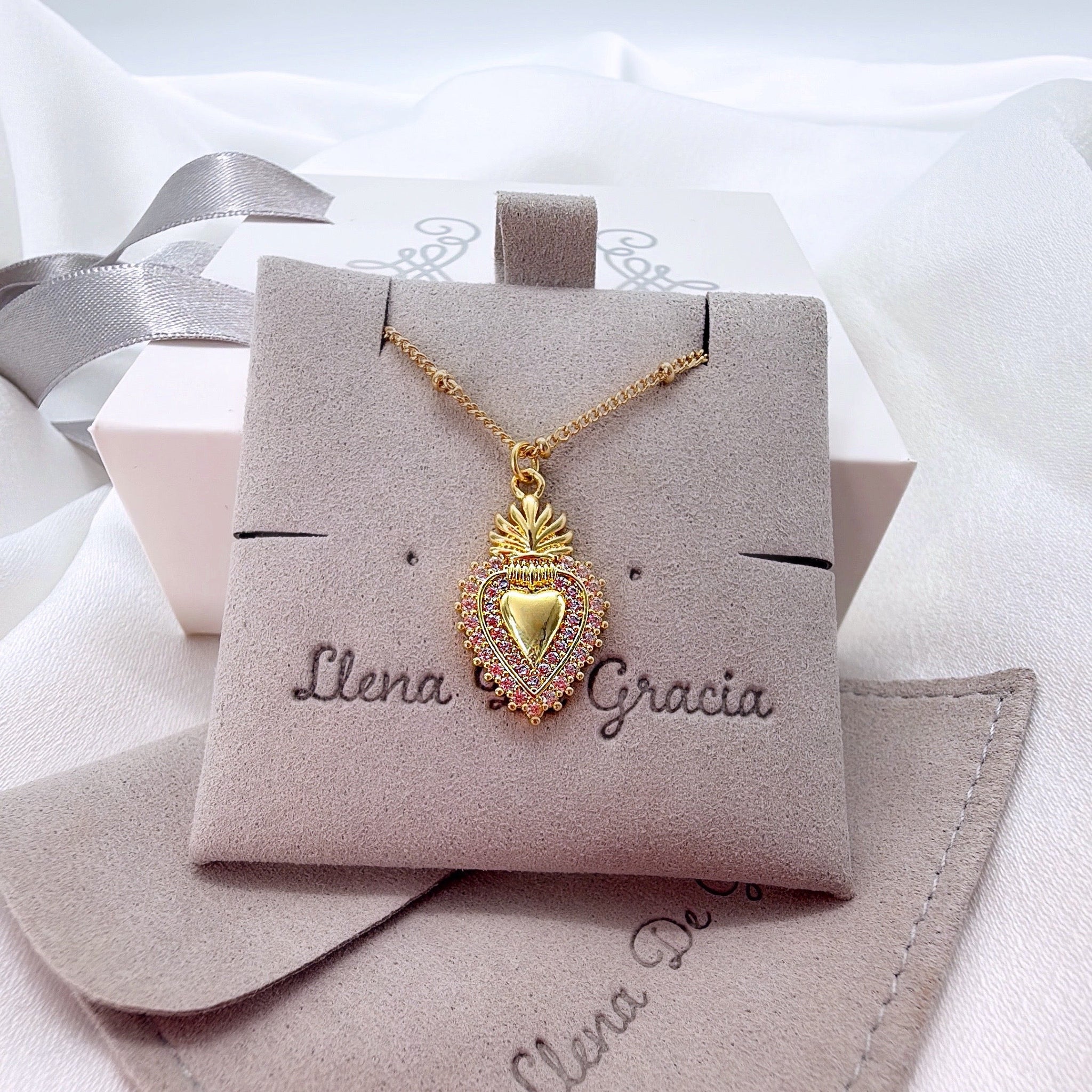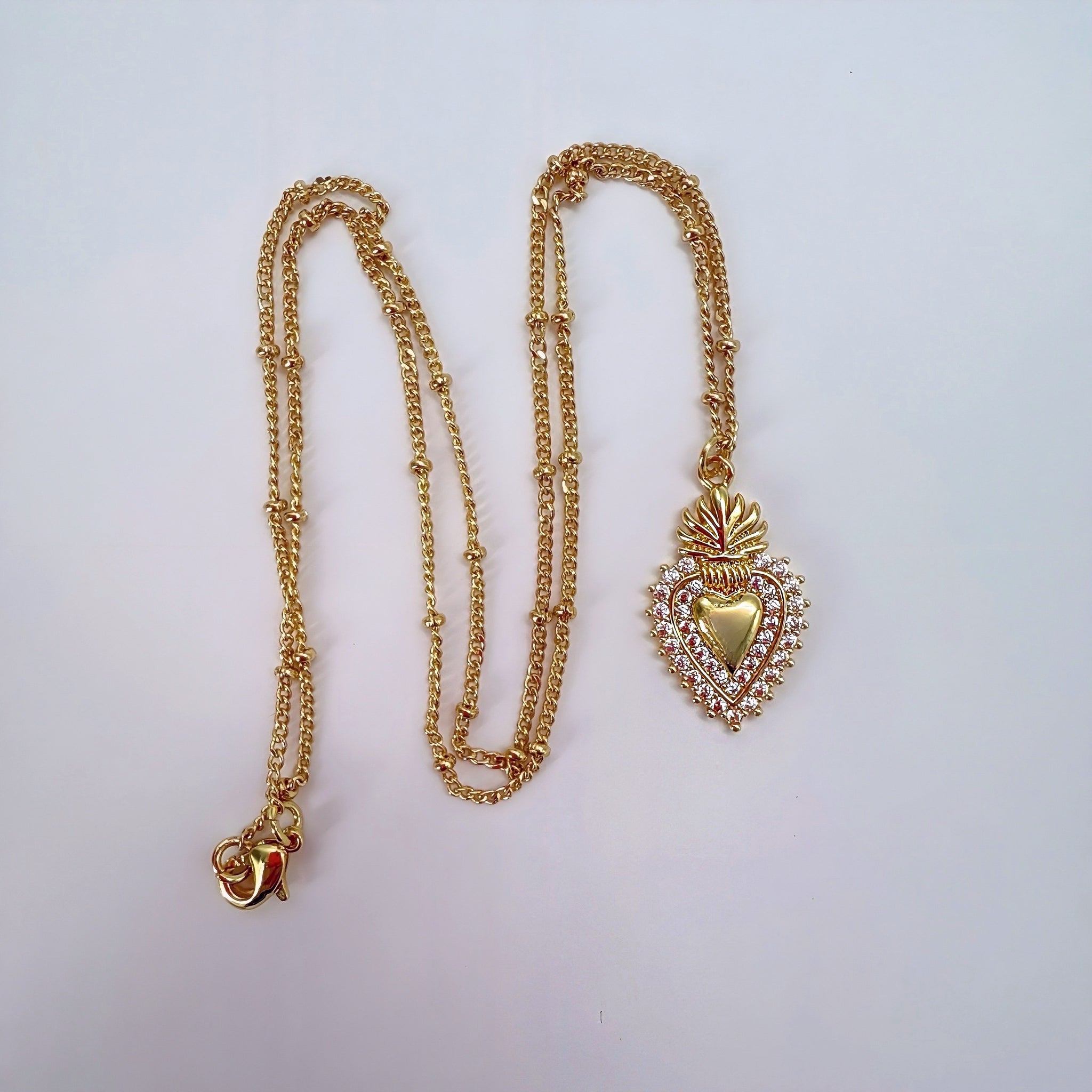 Cadena con dije del Sagrado Corazón elaborado en acero con baño de oro e incrustación de mini cristales brillantes. La cadena de mini balines también está bañada en oro, complementando perfectamente el diseño.