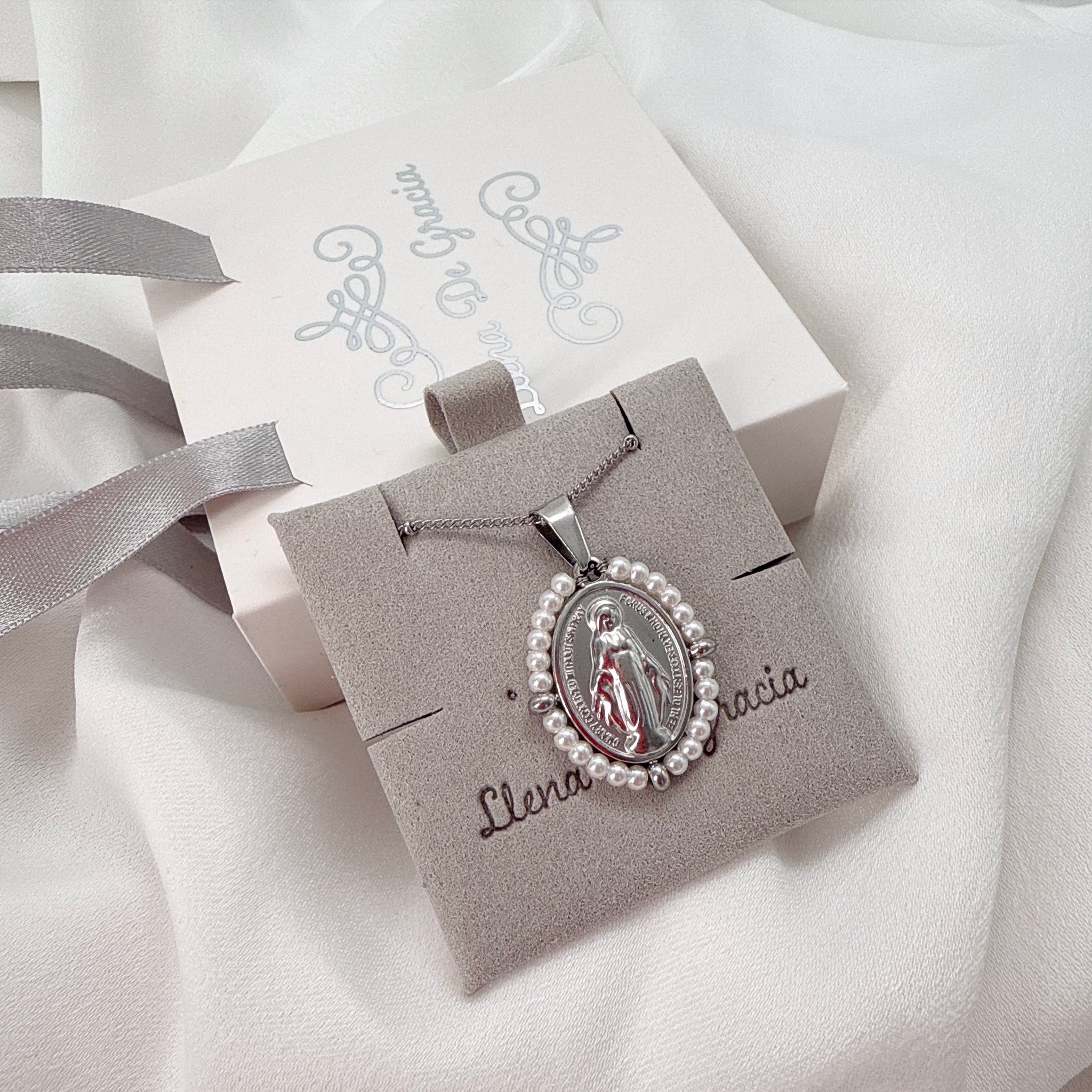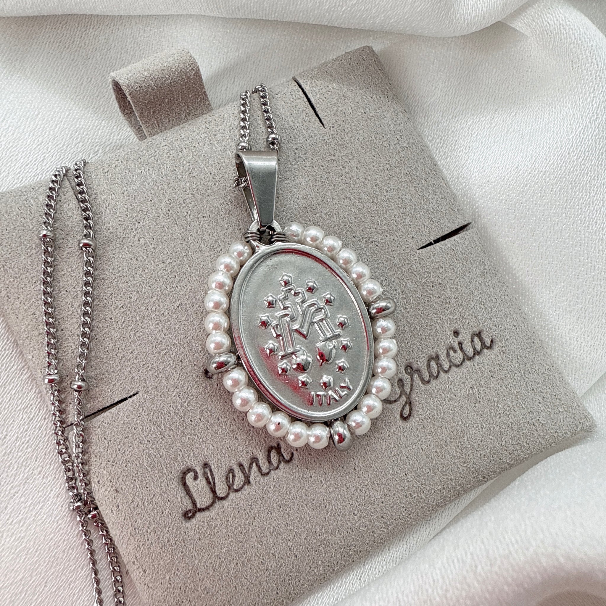 Cadena con medalla italiana de la Virgen María elaborada en plata esterlina, finamente bordada con perlas.