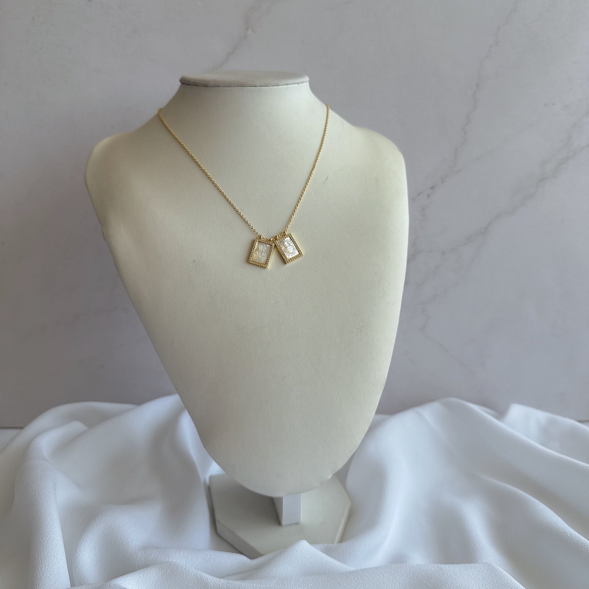 Elegante cadena en baño de oro que incluye dos mini escapularios elaborados en madre perla, con imágenes del Sagrado Corazón y Jesús. Cada medallita está finamente enmarcada con bisel en baño de oro 14K, creando una joya espiritual delicada y significativa.