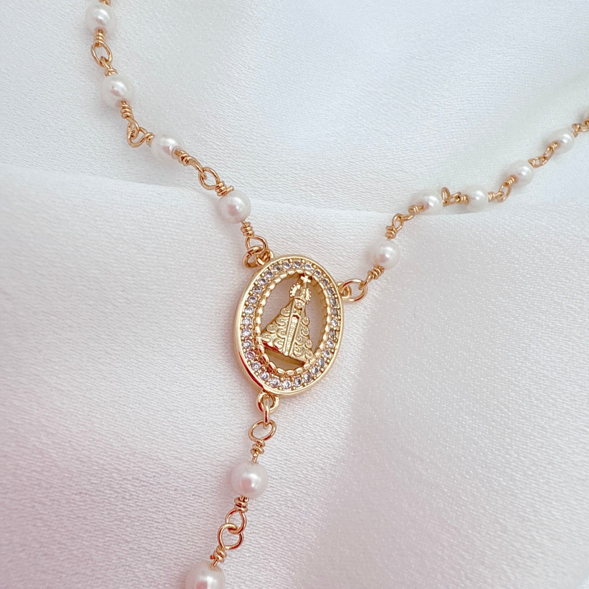 Cadena del Santo Rosario elaborado en mini perlas y baño de oro, dije de Virgencita con mini cristales y cruz.