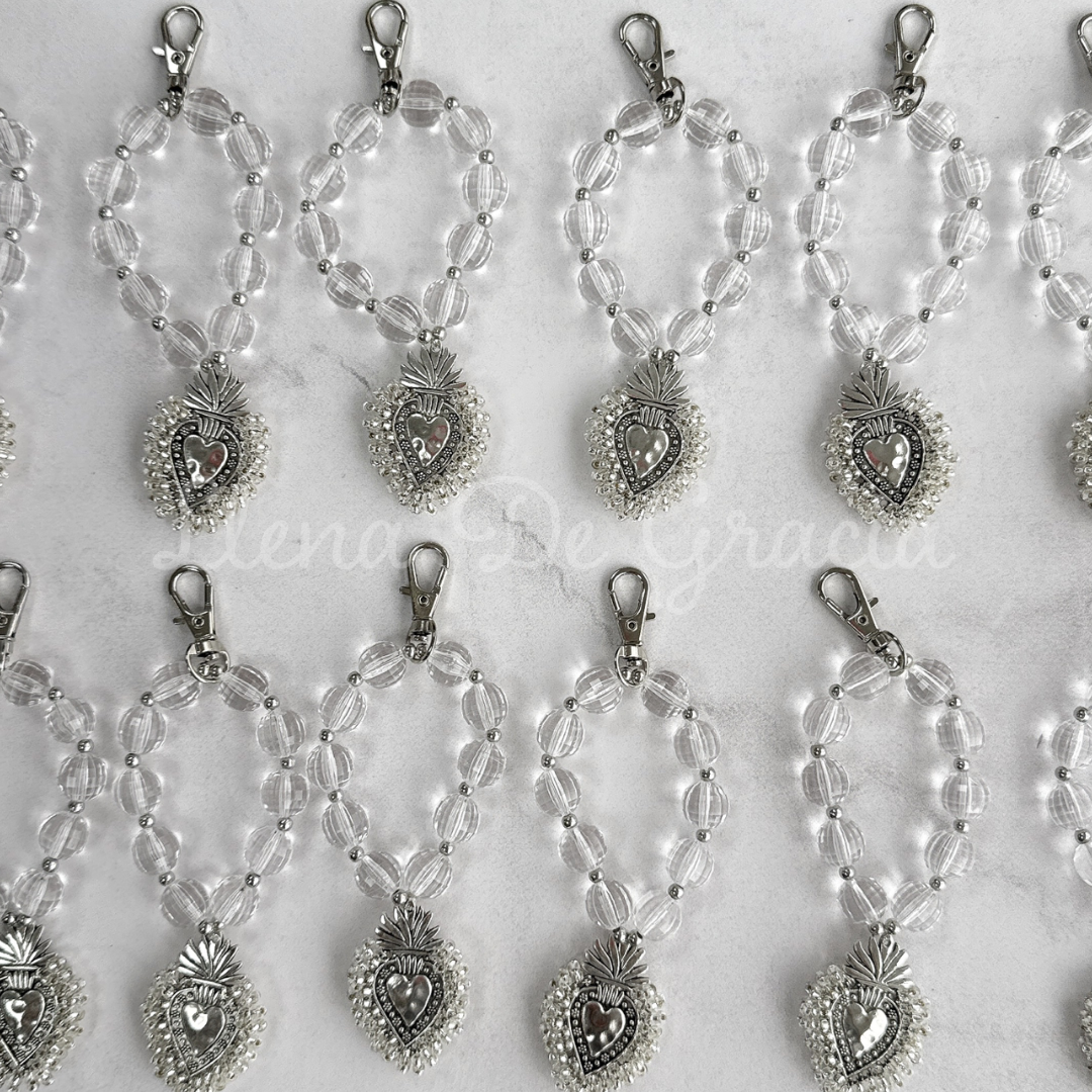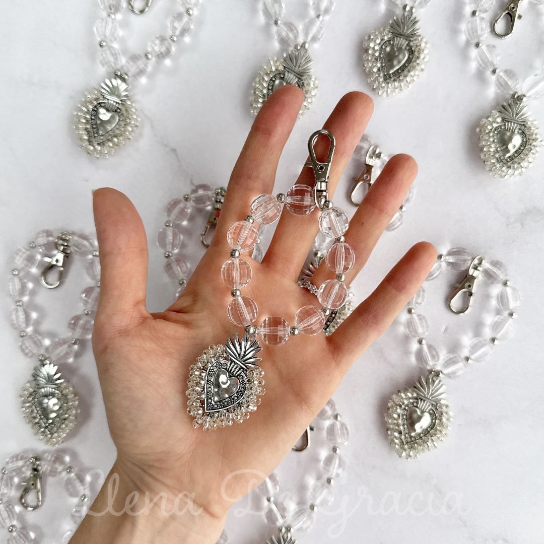 Denario elaborado en cristales celestes,  con medalla de acero inoxidable en forma de Corazon bordado manualmente en mini cristales.
