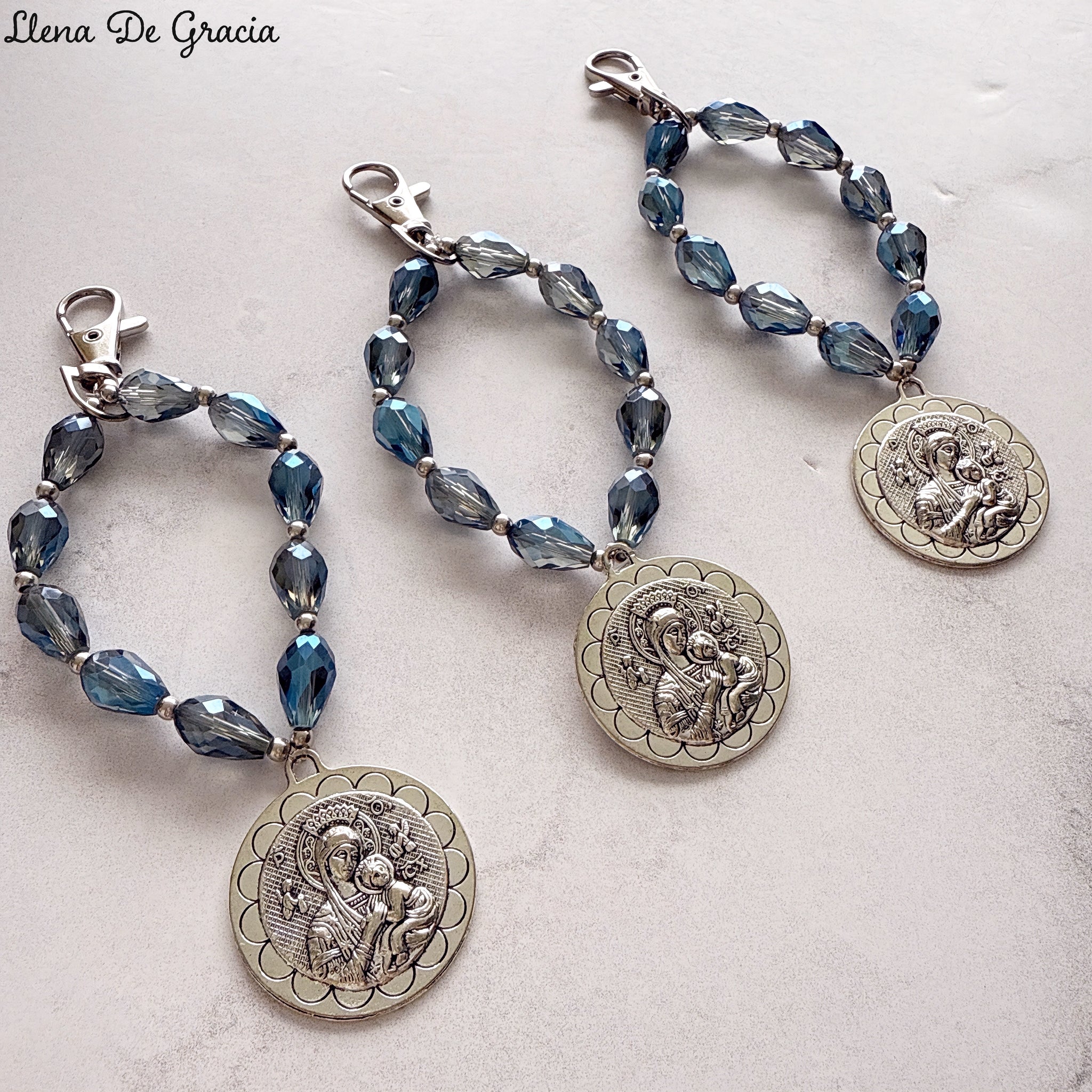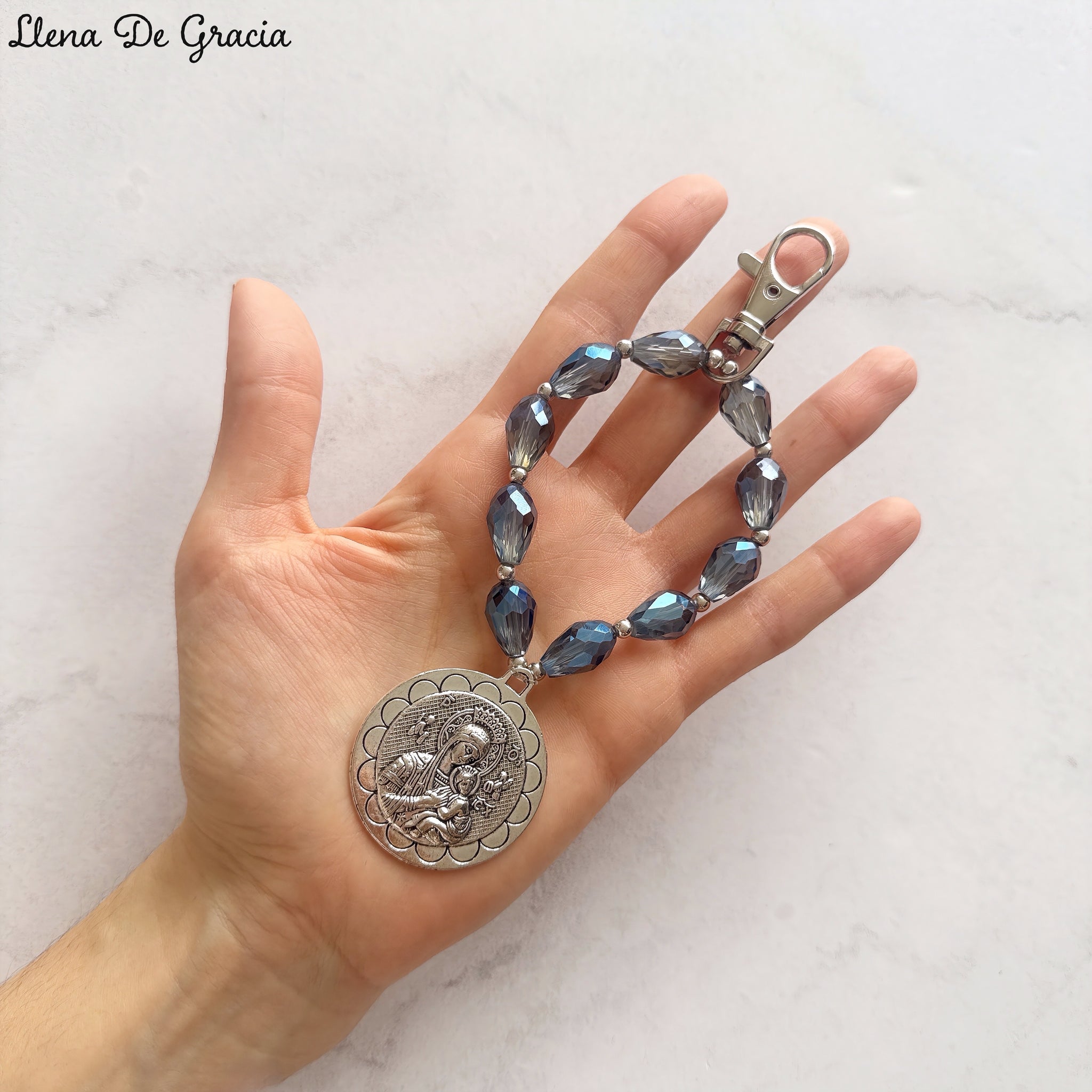 Denario con gancho, elaborado en cristales gota. Medalla con baño en rodio, de 3 cm de diámetro.