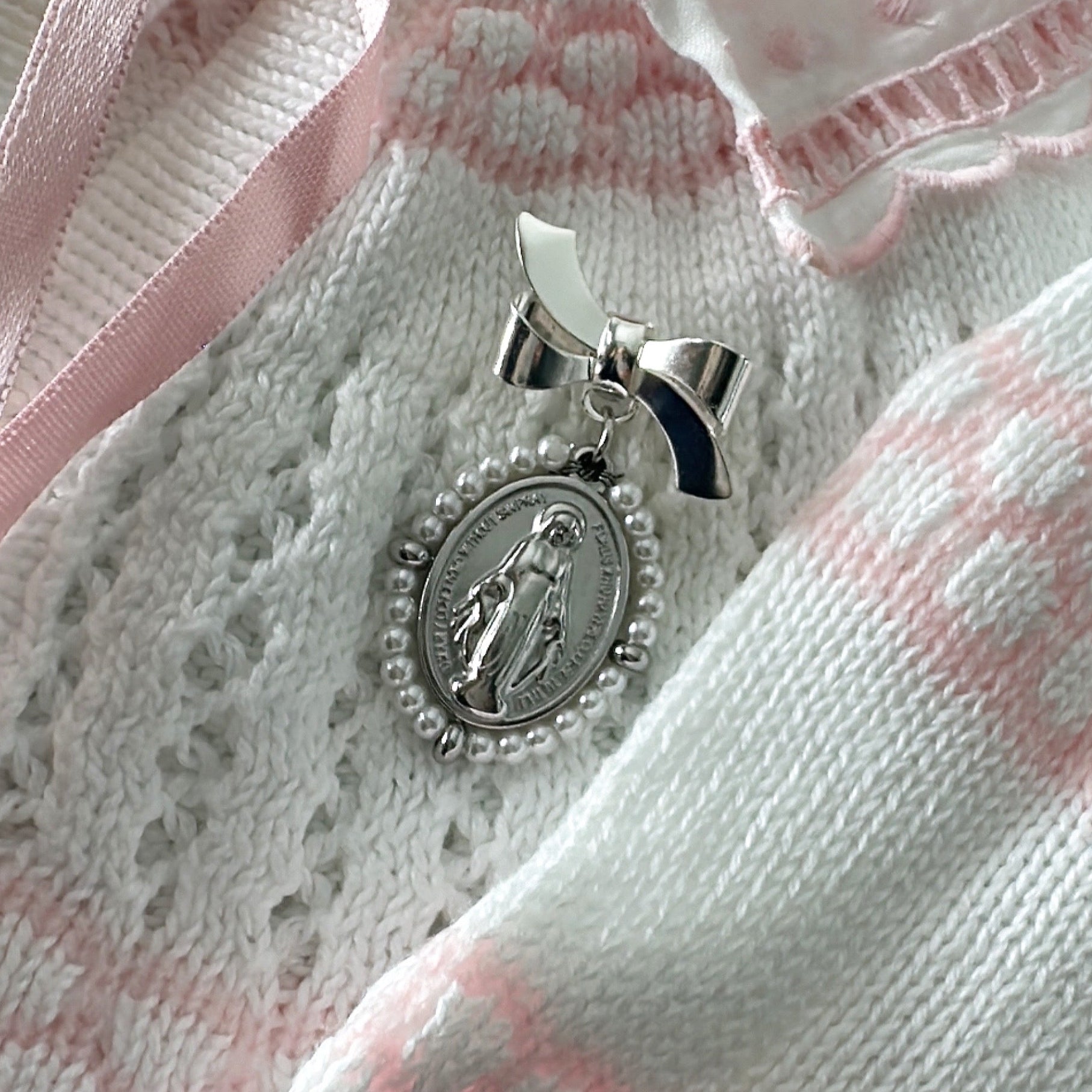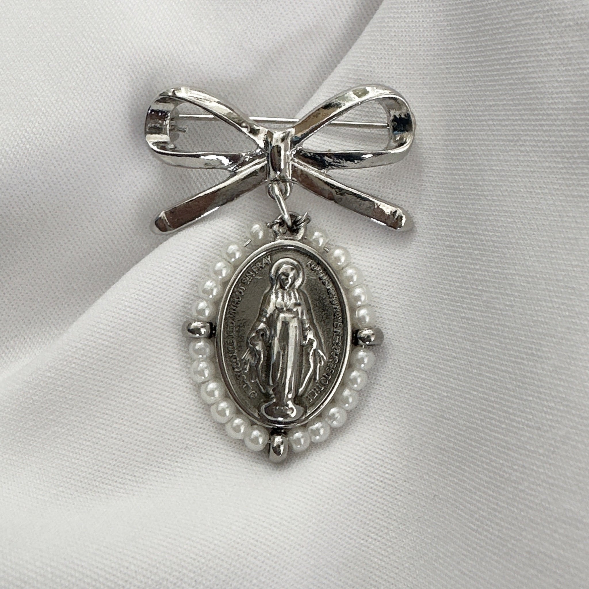 Delicado y significativo pin de lazo en plata 925, acompañado de una hermosa medalla italiana de la Virgen María elaborada en plata ésterlina, finamente bordada con perlas naturales.