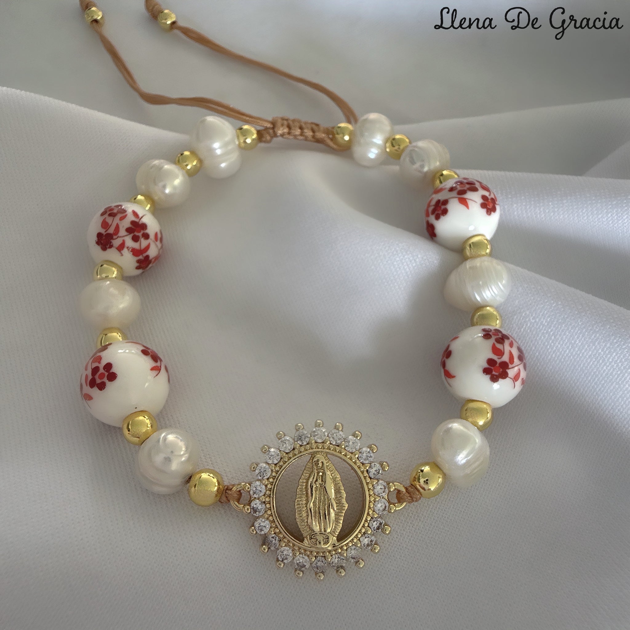 Pulsera elaborada a mano con perlas naturales de agua dulce y balines de acero quirúrgico, complementada con un delicado dije de la Virgen María de Guadalupe en baño de oro 14k. Un accesorio elegante y lleno de fe, perfecto para regalar o para uso personal.