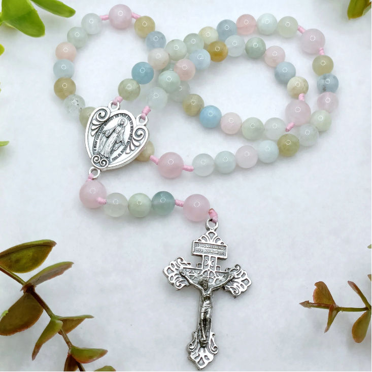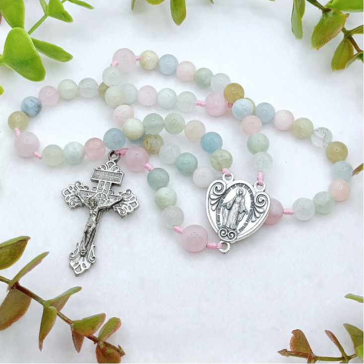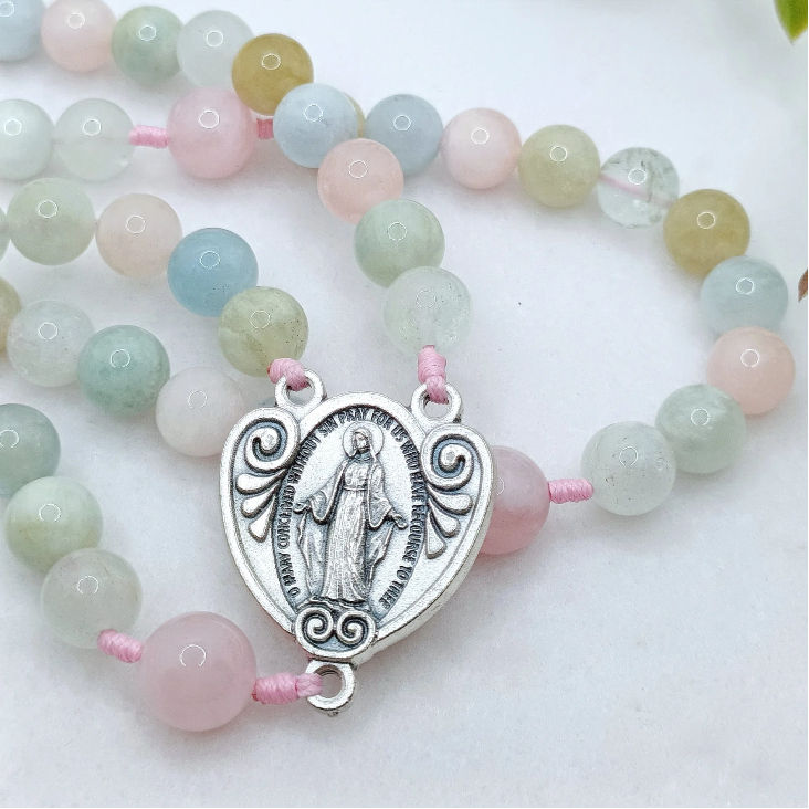 Hermoso Santo Rosario Católico, elaborado con delicadas cuentas de porcelana acrílica en colores pastel. Su diseño único y femenino lo convierte en un accesorio lleno de espiritualidad y elegancia.