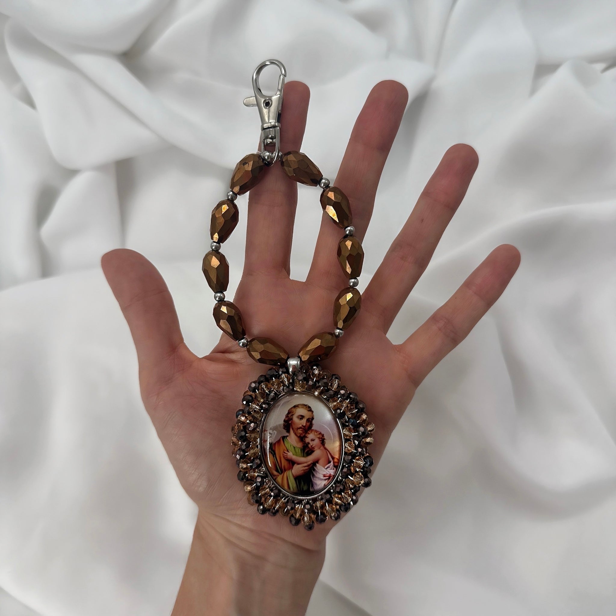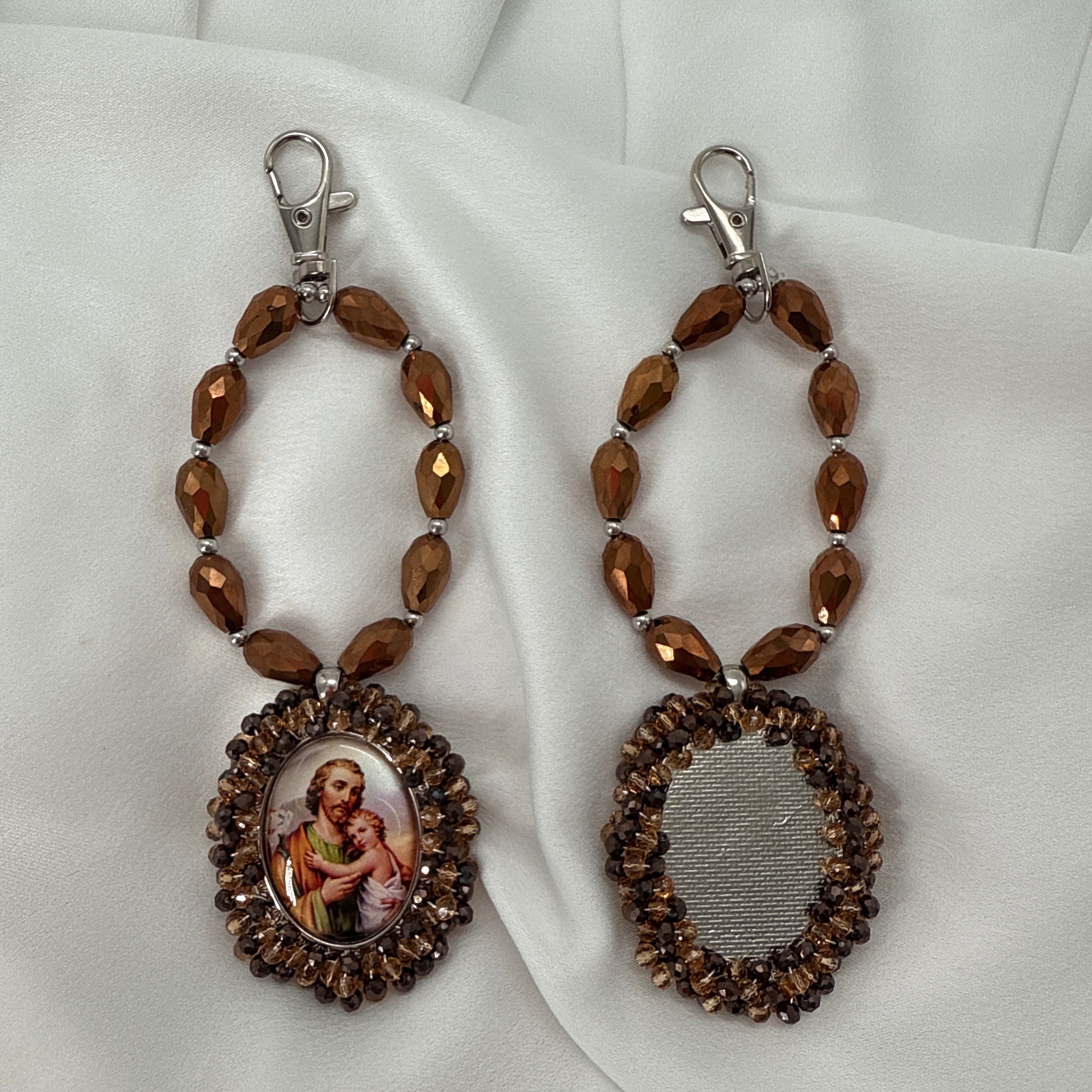 Hermoso denario/ llavero con medalla de San José bordada en cristales cafes, ideal para colgar en tu bolso, llevar en el carro y tener siempre contigo