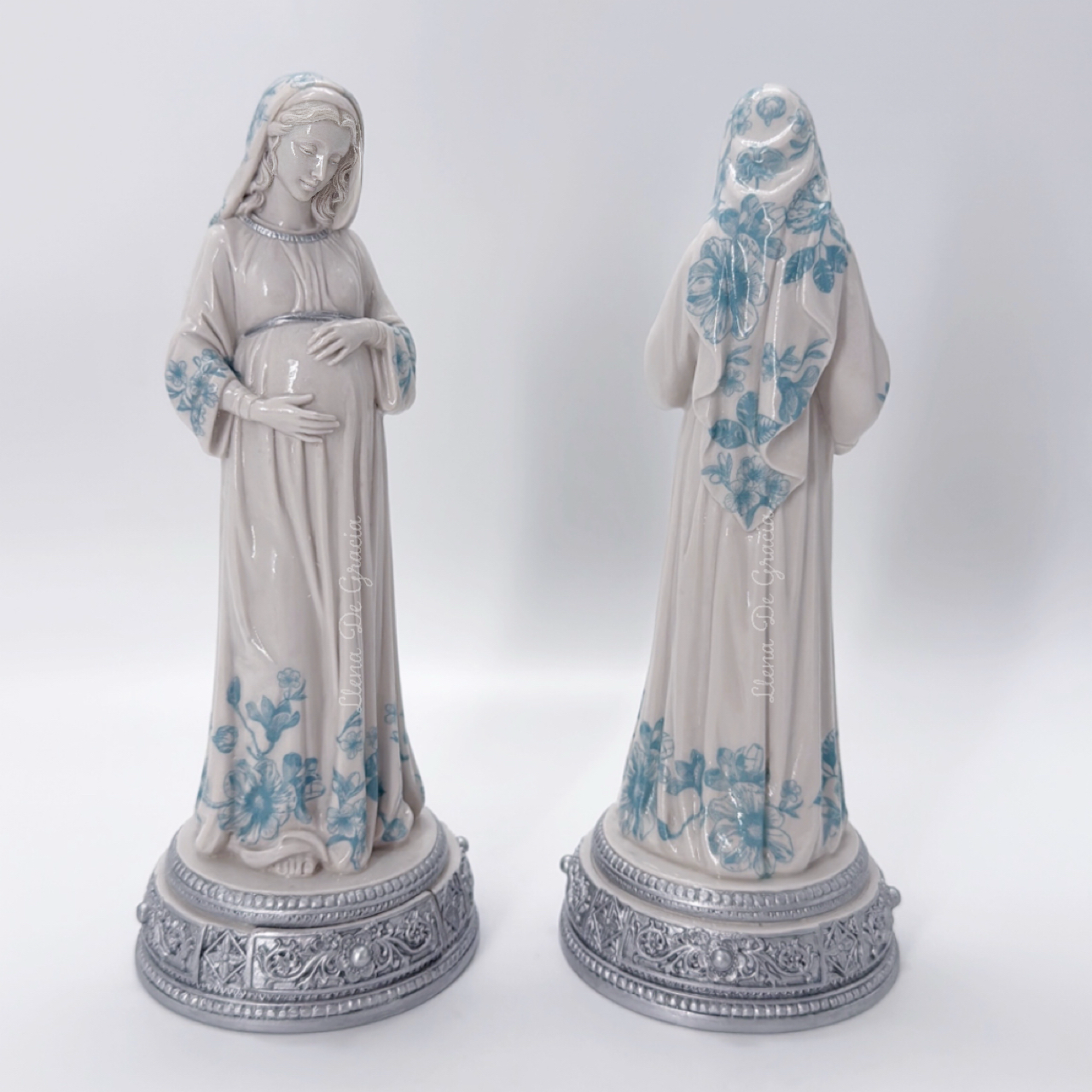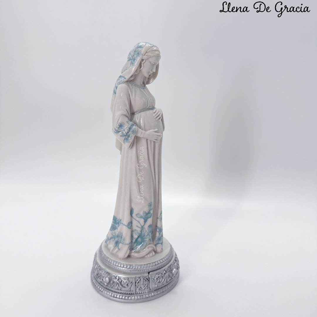 Hermosa figura de la Virgen María de la Dulce Espera de 24 cms, elaborada en resina marfil y pintada a mano utilizando diversas técnicas de arte; perfecta para la devoción y oración. Este kit de regalo incluye todo lo necesario para una presentación especial y llena de fe.