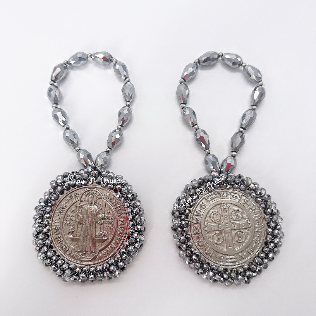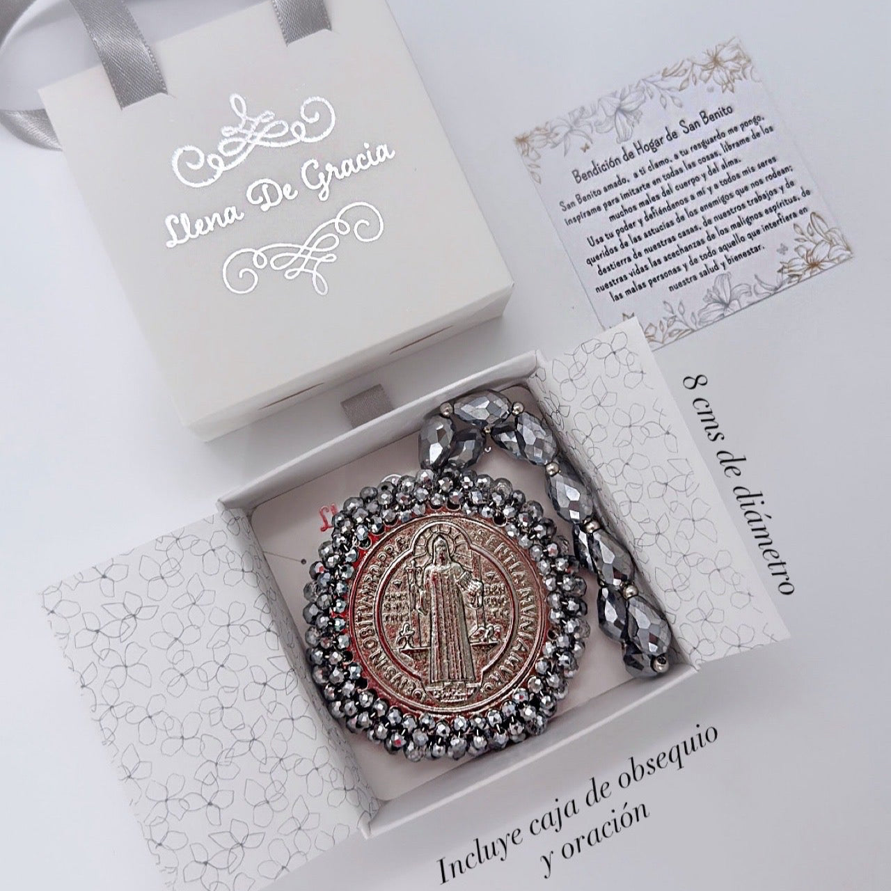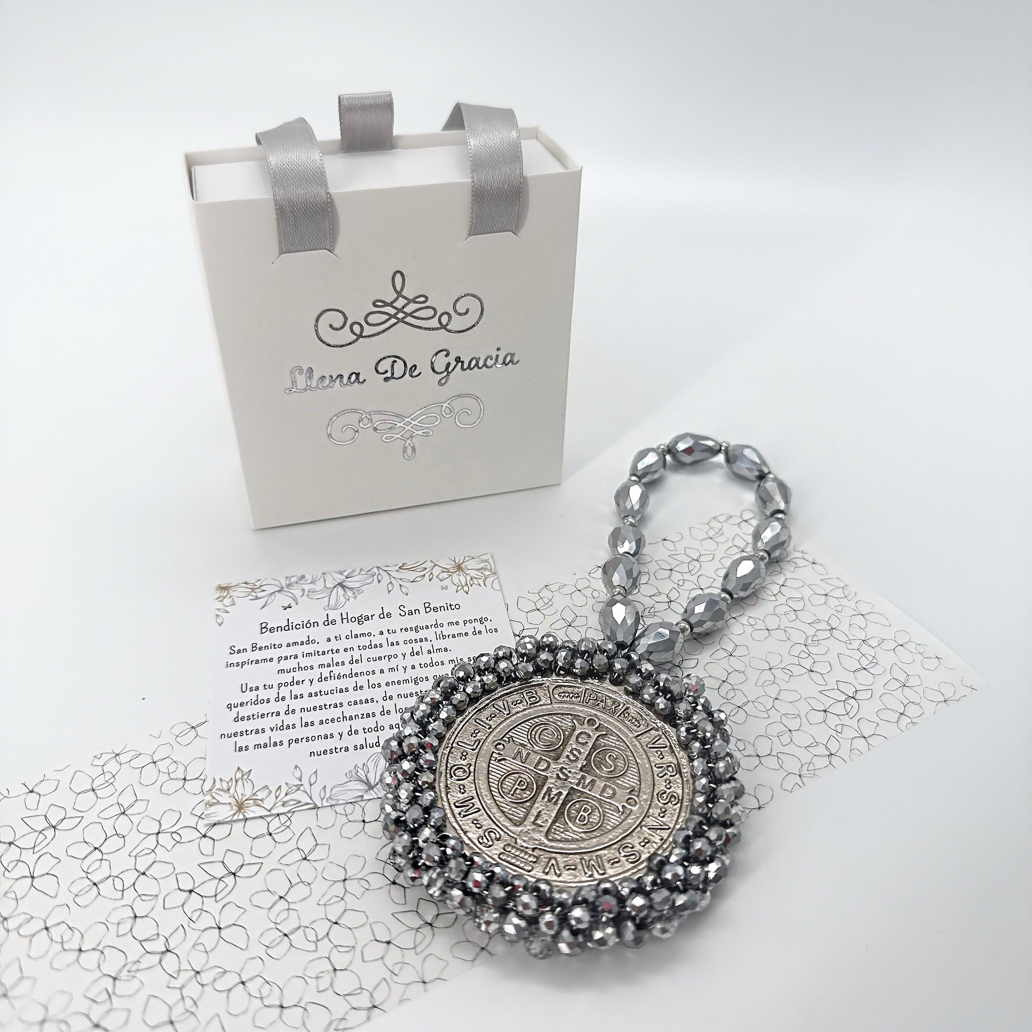 Hermosa Bendición de hogar con la poderosa Medalla de San Benito de 8 cms de diámetro, elaborada en plata esterlina y bordada artesanalmente con cristales. Este producto ha sido diseñado para colgar en la puerta, lleva colgante de cristales.