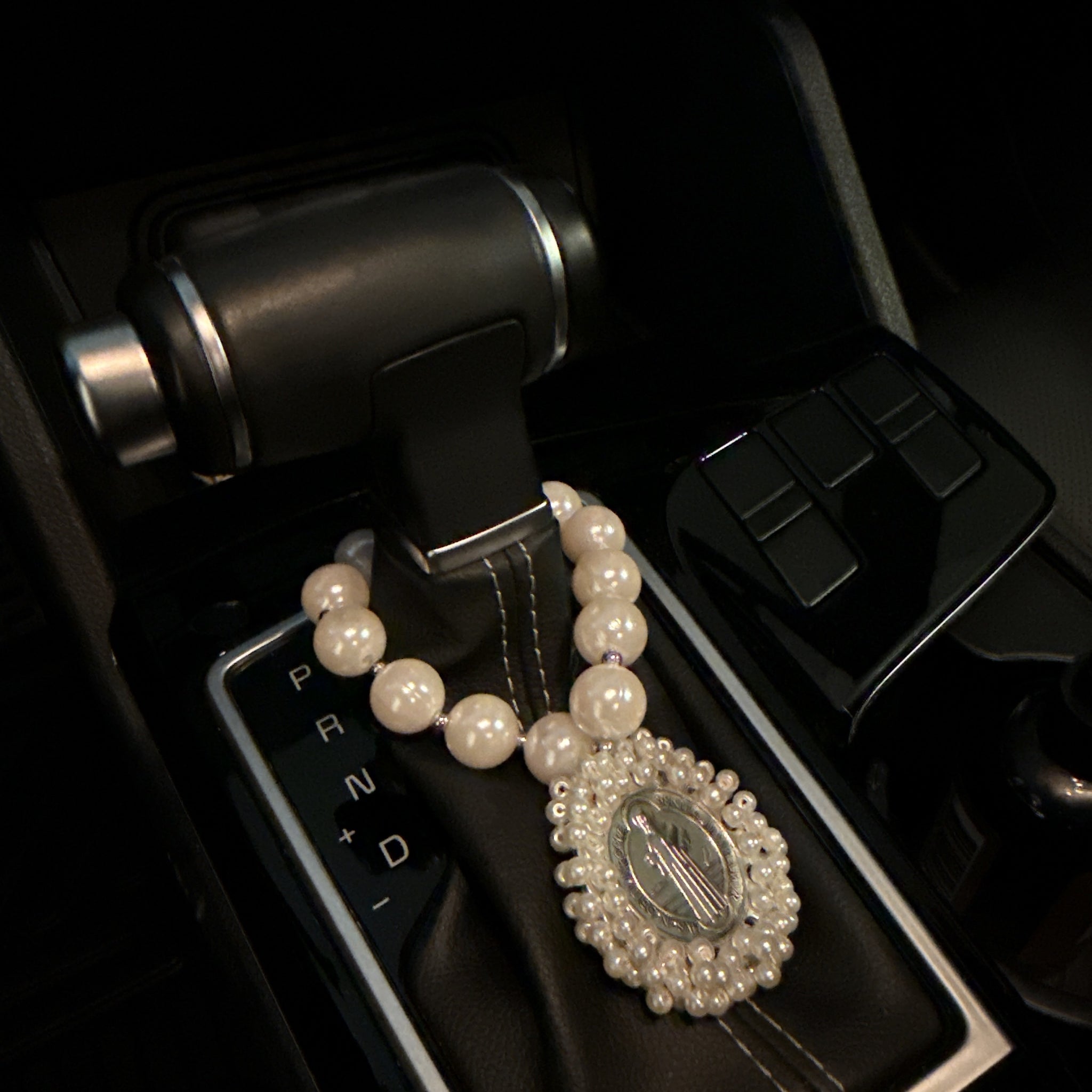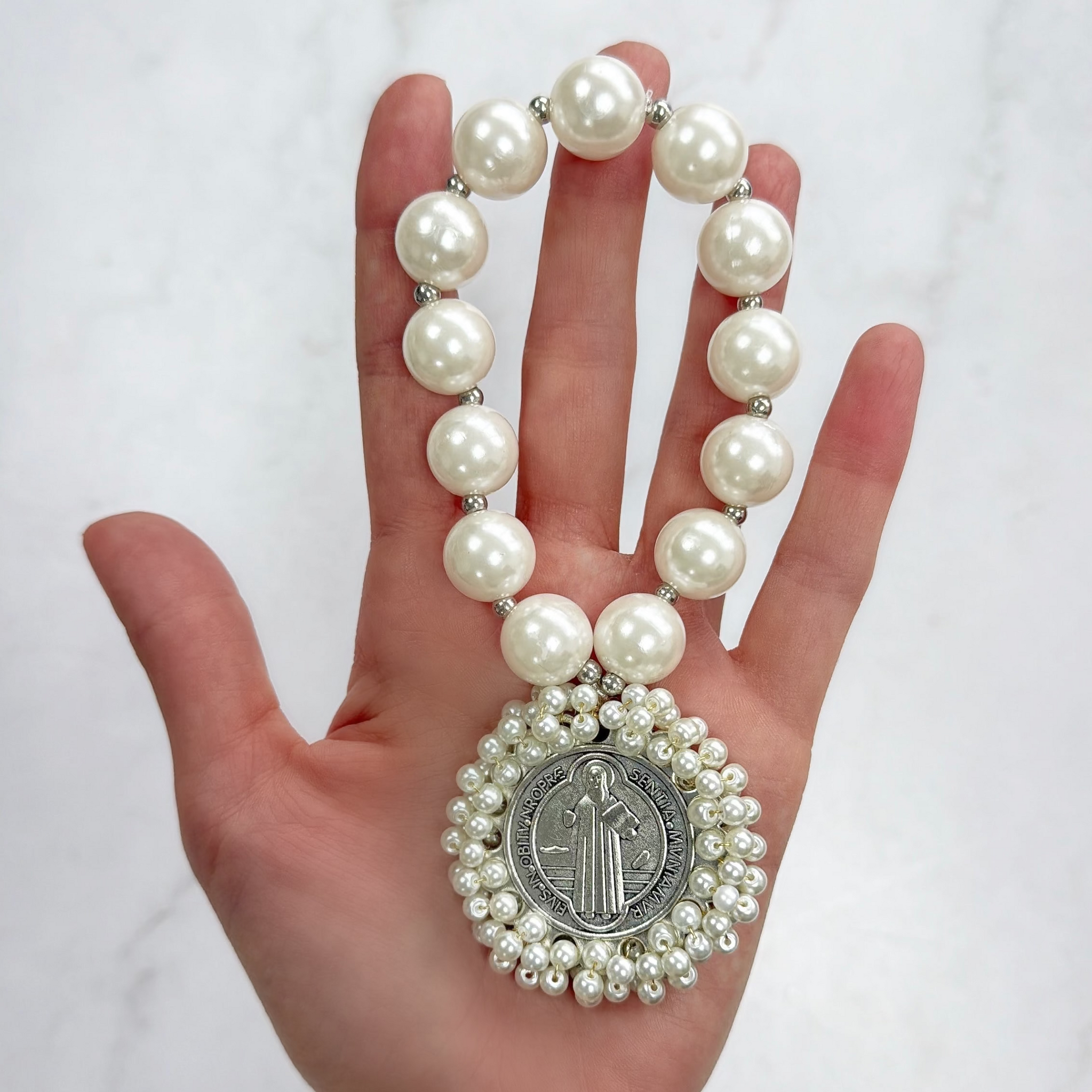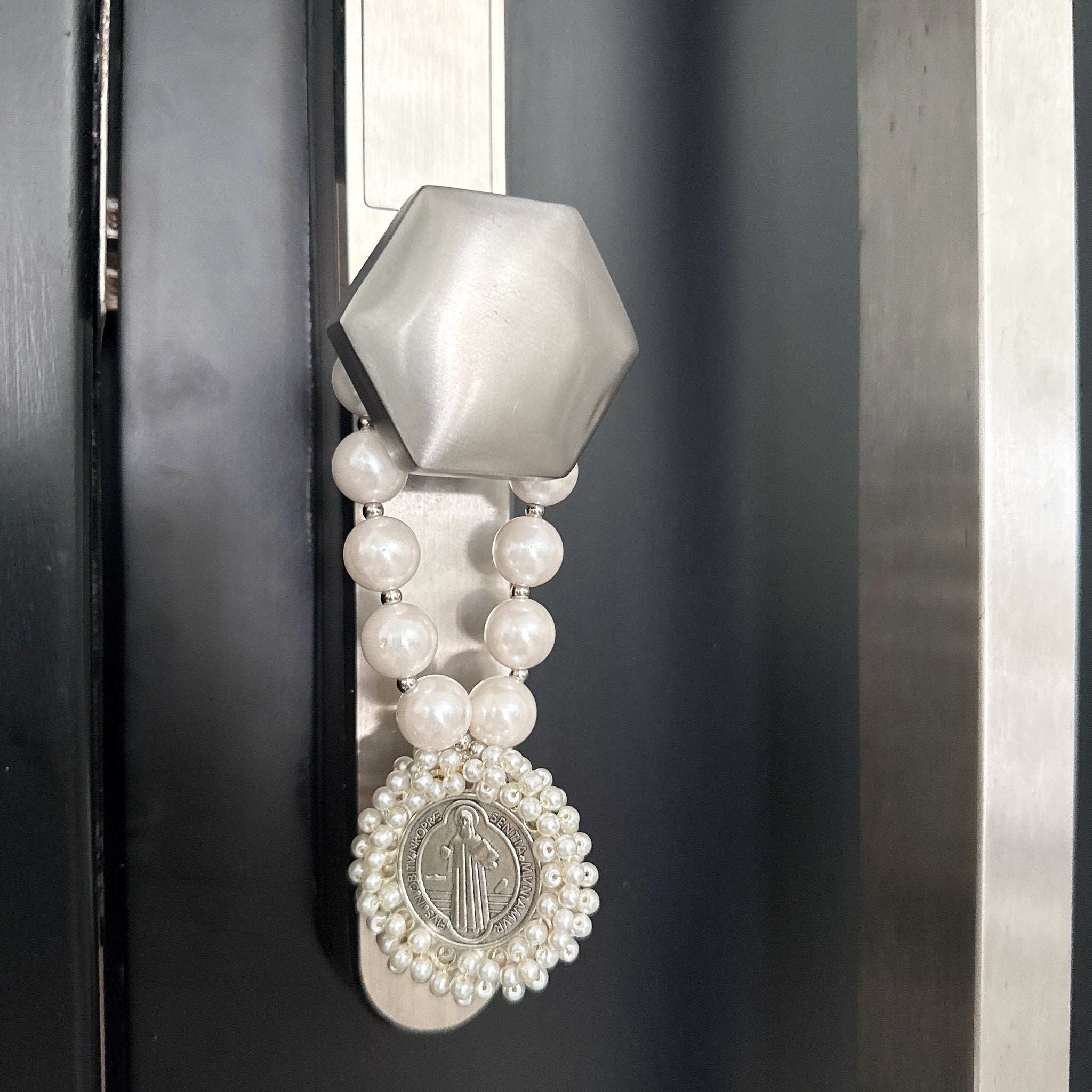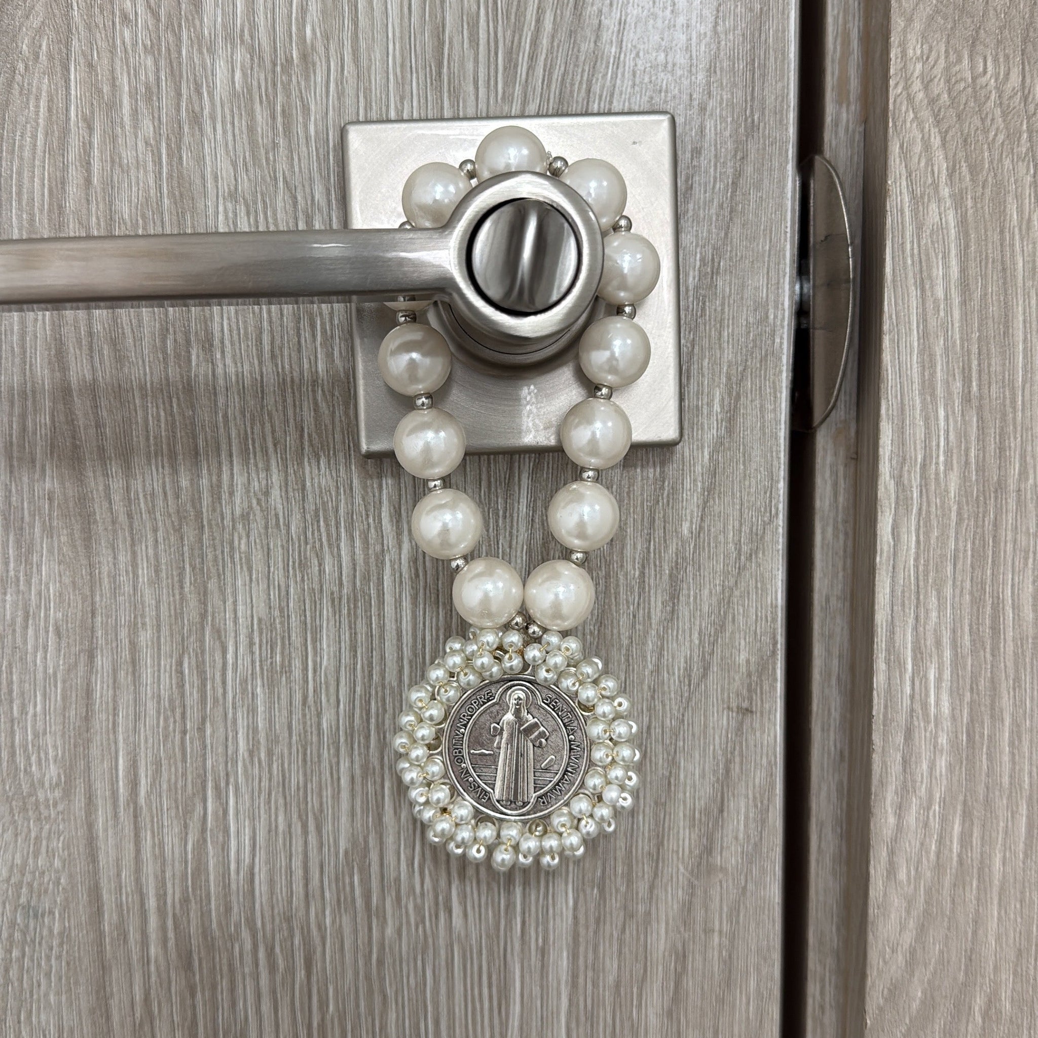 Hermosa Bendición de hogar con la poderosa Medalla de San Benito de 5 cms de diámetro, elaborada en plata esterlina y bordada artesanalmente con perlas beige. Este producto ha sido diseñado para colgar ya sea en la puerta, en el carro o donde desees.