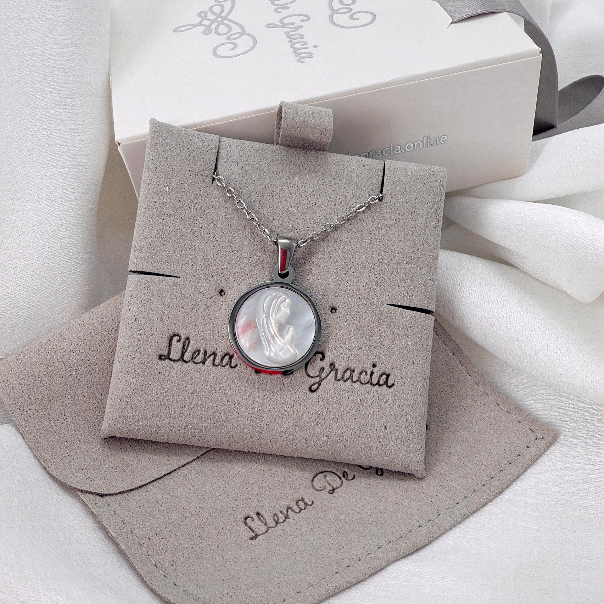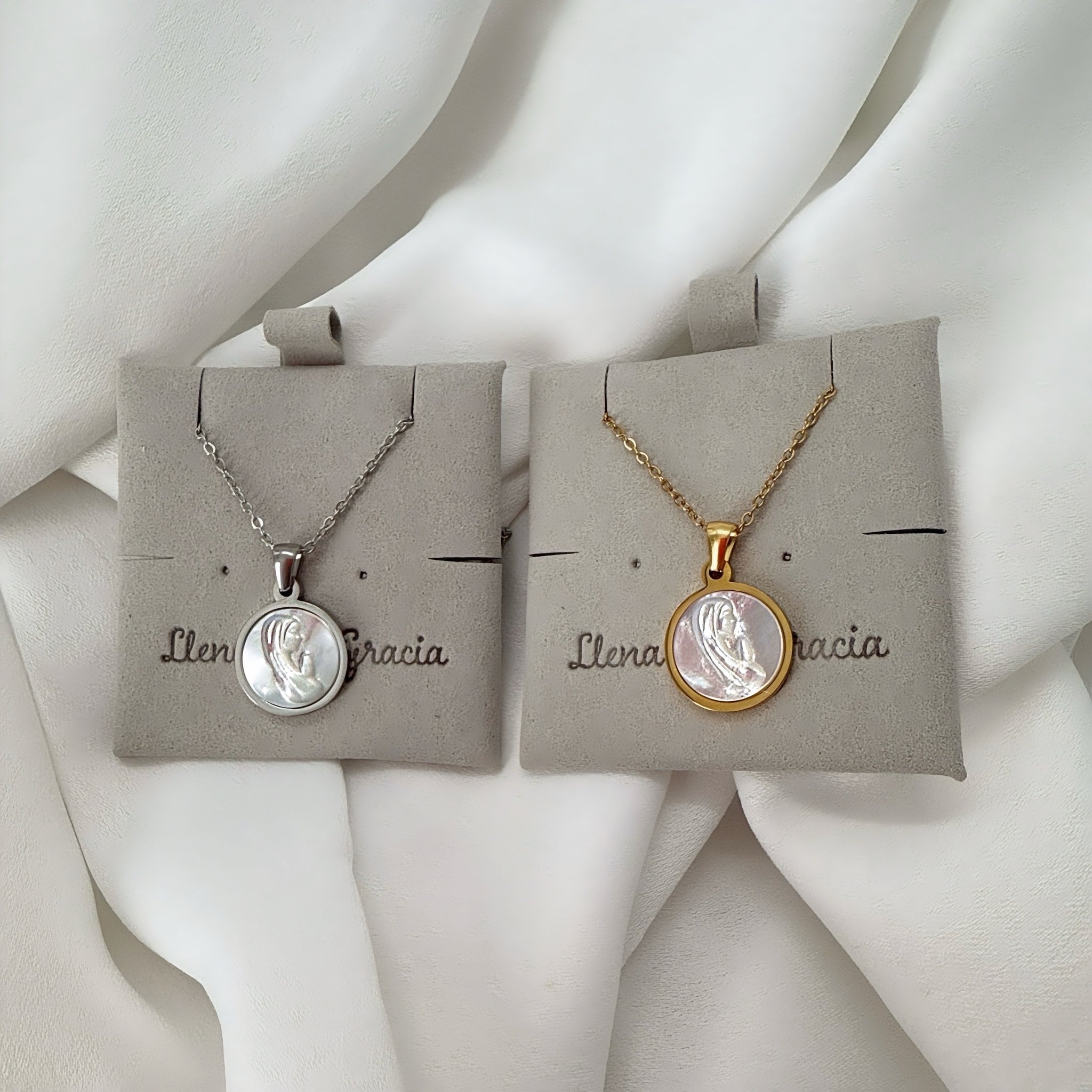 Elegante cadena con dije italiano elaborado en madre perla, realzado con un fino bisel en baño de oro 14k o plata esterlina 925. Una joya sofisticada que combina estilo y espiritualidad, perfecta para uso diario o como regalo especial.