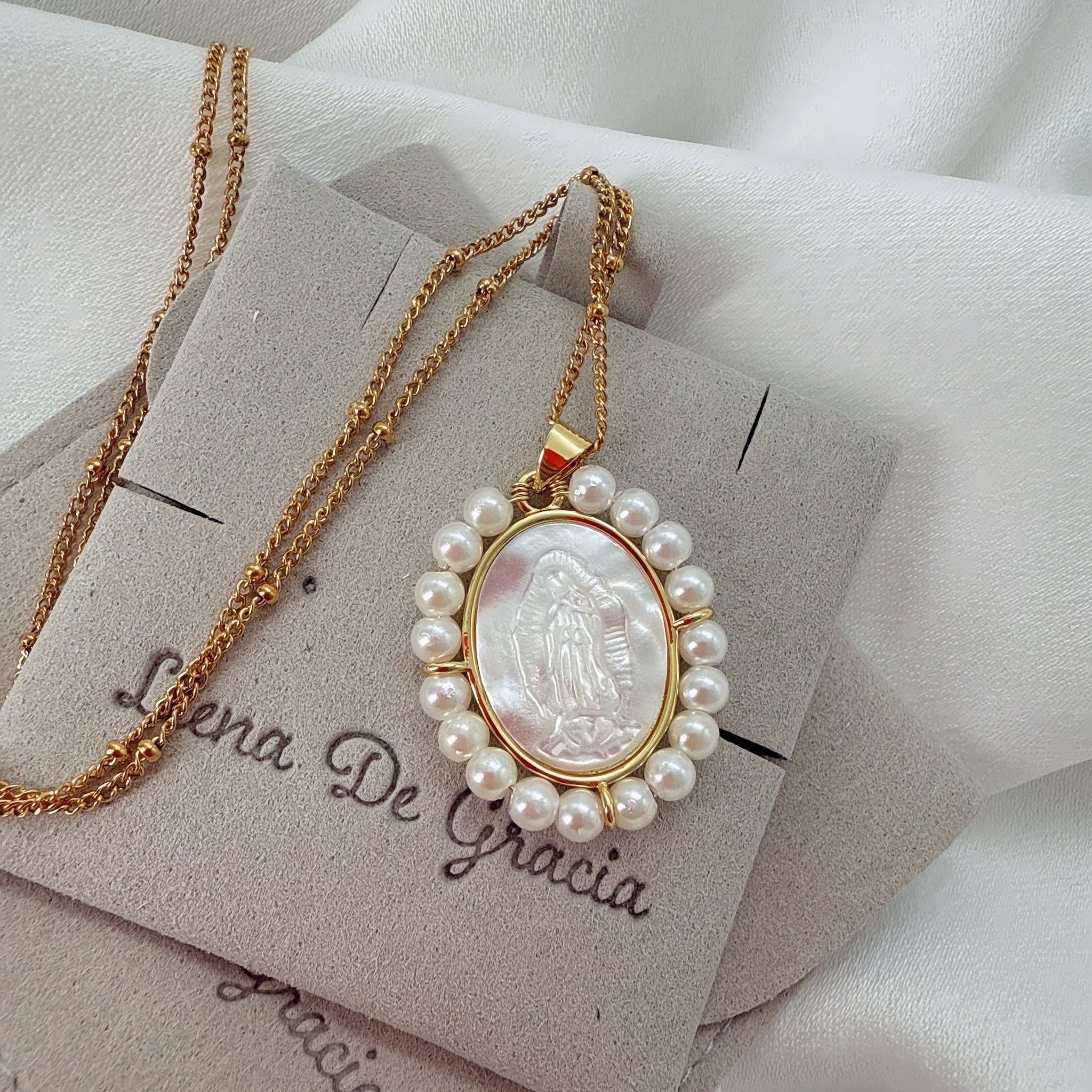 Hermosa y delicada cadena bañada en oro, acompañada de una medalla ovalada elaborada en madre perla, con bisel en baño de oro 14k. Detalles bordados en perlas naturales realzan su elegancia y espiritualidad.