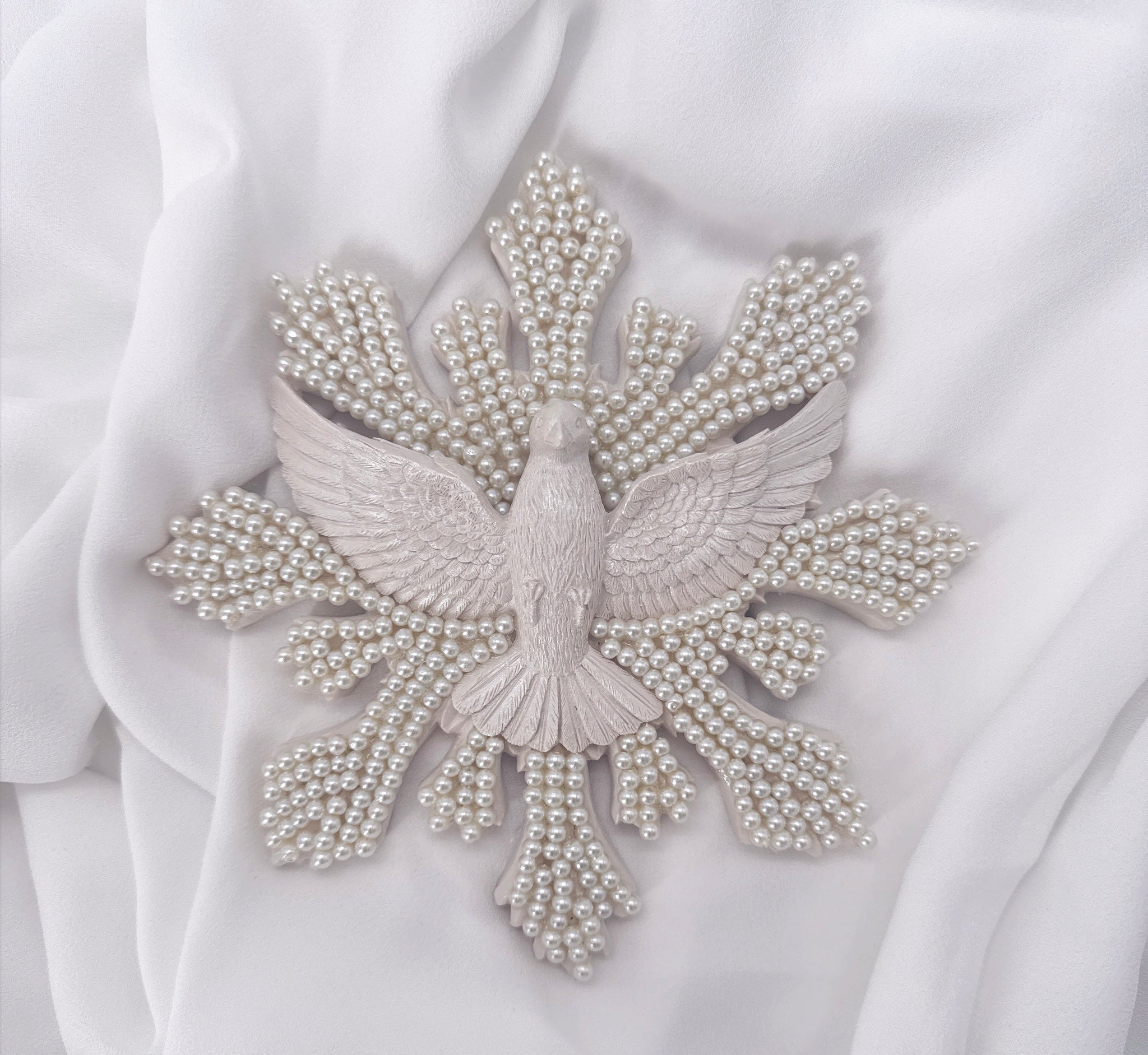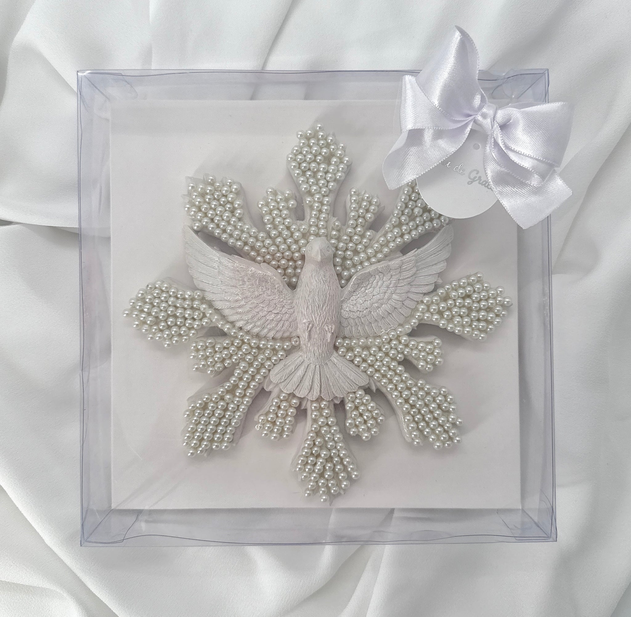 Hermosa figura del Espíritu Santo elaborada en resina y delicadamente cubierta en perlas, ideal para decorar tu hogar con un símbolo de fe y protección. Su diseño elegante y detallado la convierte en una pieza especial para oratorios, salas o habitaciones.