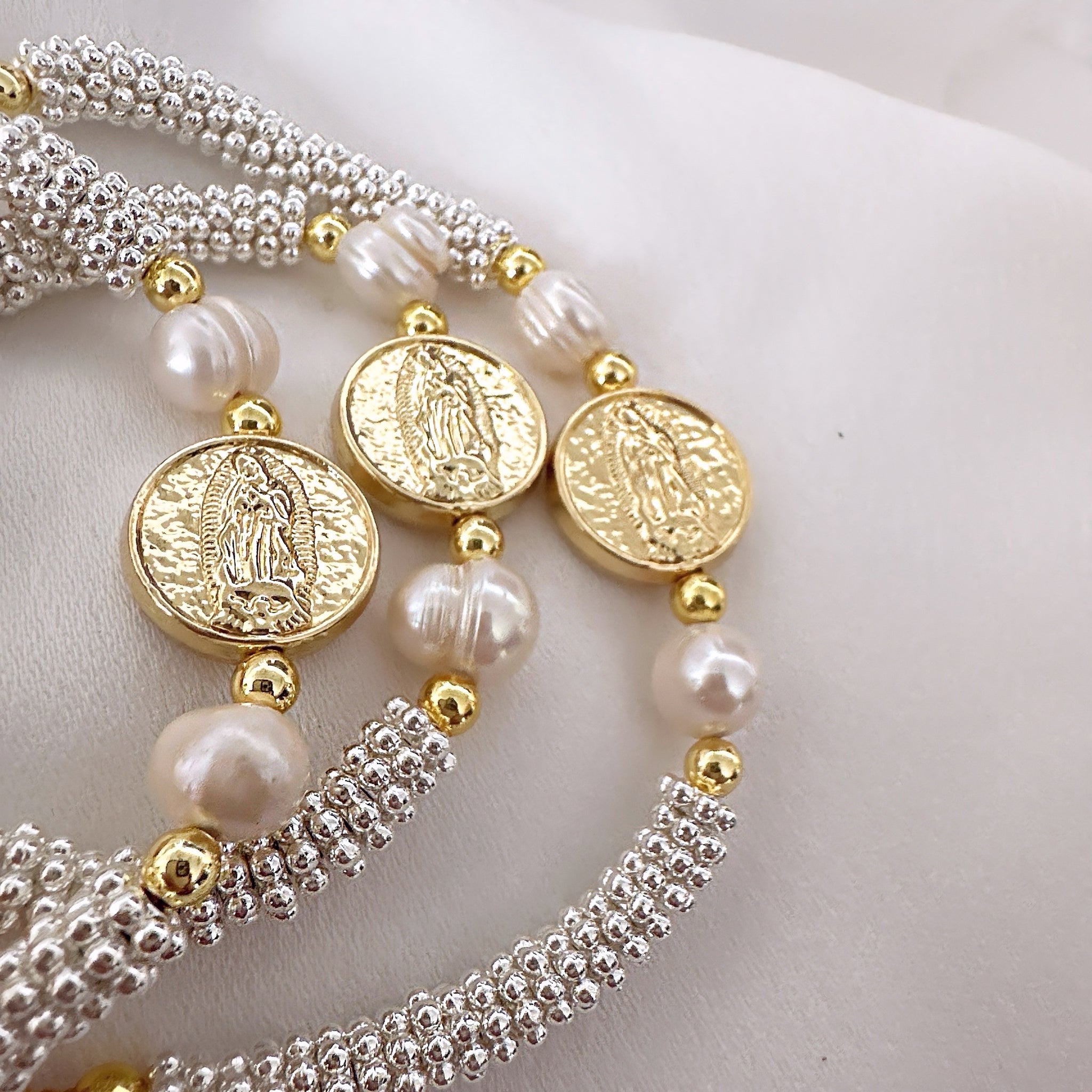 Hermosa pulsera con dije de la Virgen María de Guadalupe en baño de oro 14k, finamente trabajada con incrustaciones de perlas naturales de agua dulce y balines de acero quirúrgico. Un accesorio de fe, delicadeza y elegancia, ideal para regalar o llevar contigo como símbolo de protección y devoción.