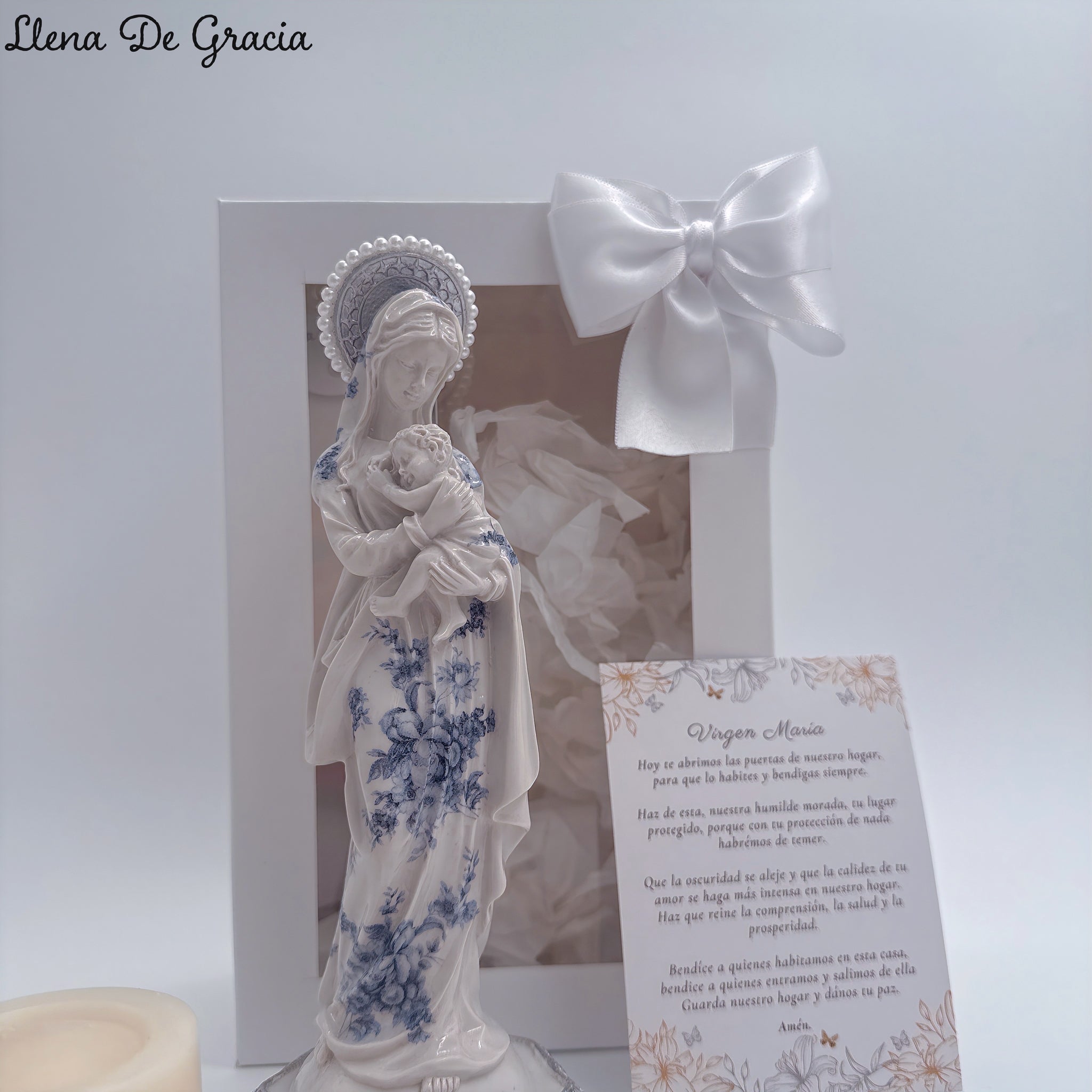 Hermosa figura de la Virgen María de la Salud de 24 cms de altura, elaborada en resina marfil de alta calidad y pintada a mano utilizando diversas técnicas de arte, ideal para la devoción y oración en el hogar.