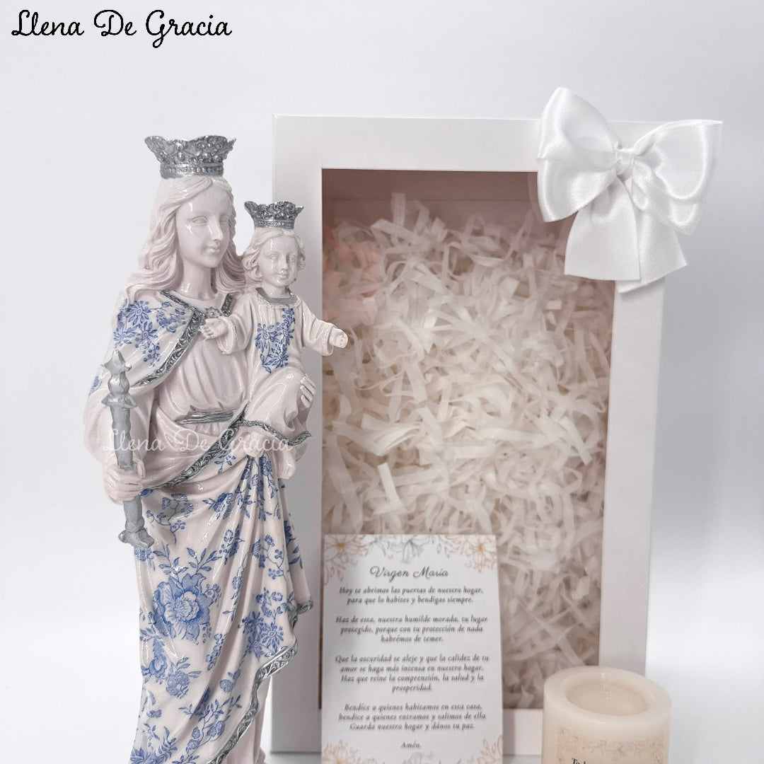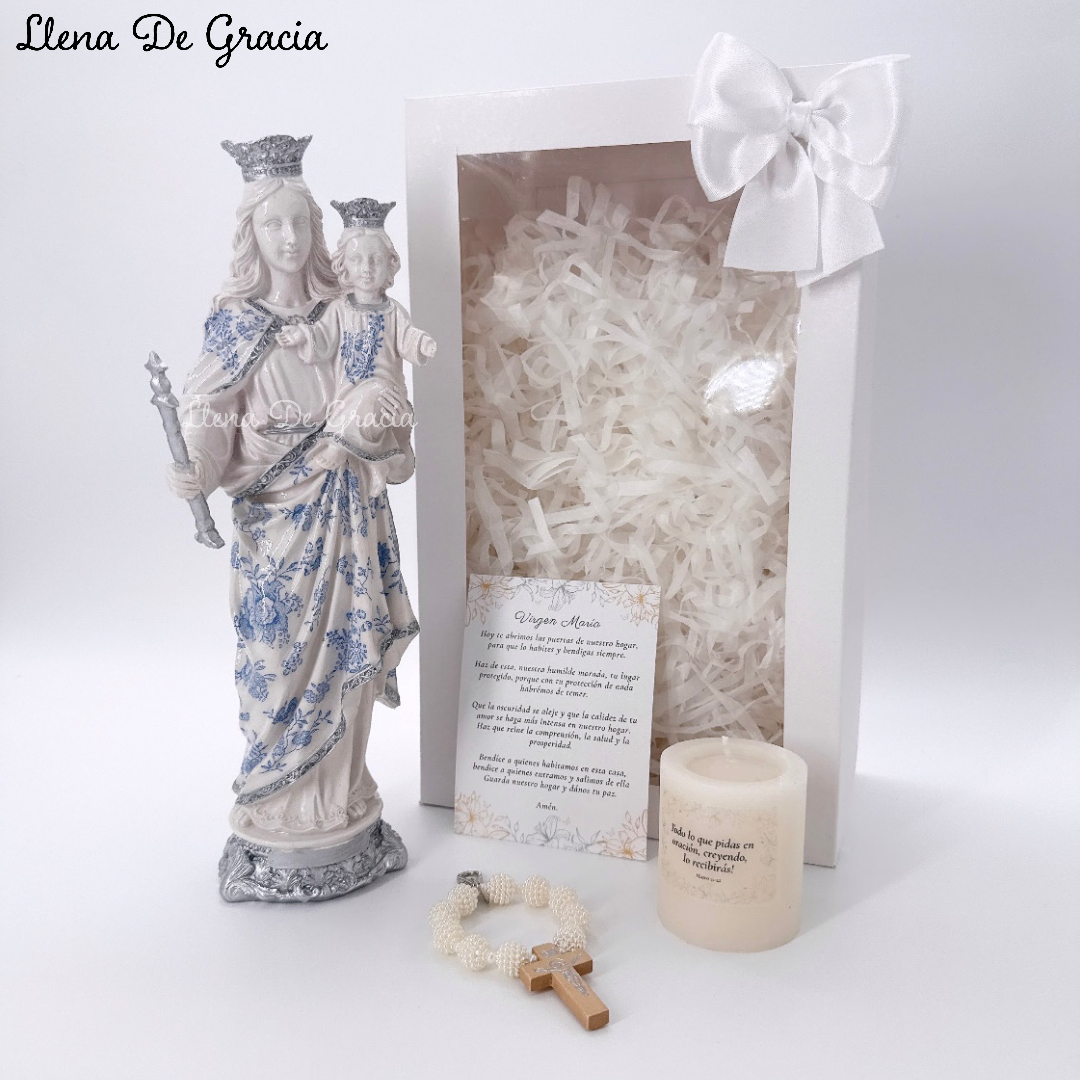 Este hermoso kit de regalo está dedicado a la Virgen María Auxiliadora (31 cms de altura), y ha sido cuidadosamente elaborado para llenar tu hogar de fe y devoción. La figura está hecha en resina Marfil, con detalles delicadamente trabajados.