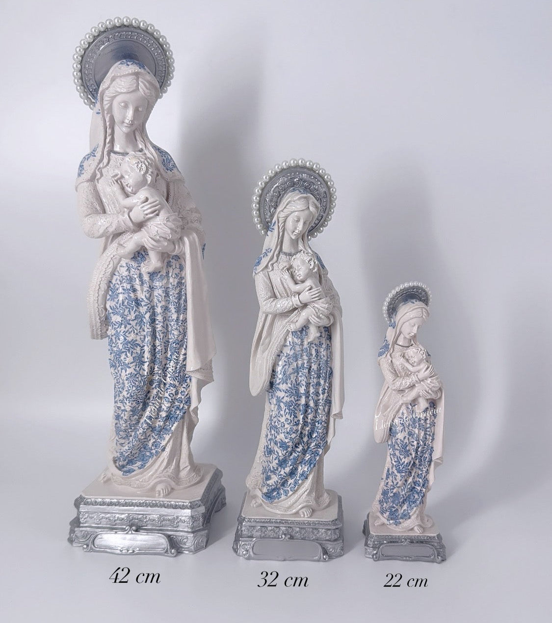 Hermosa figura de la Virgen María de la Salud, elaborada en resina marfil de alta calidad y pintada a mano utilizando diversas técnicas de arte, ideal para la devoción y oración en el hogar.